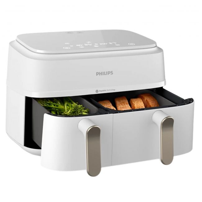 Frytownica na gorące powietrze Dual Basket Airfryer z serii 3000 firmy Philips umożliwia przygotowywanie posiłków tak, aby dwie potrawy były gorące i gotowe jednocześnie. Przyrządzaj smaczne i zdrowe posiłki dzięki dużej szufladzie, w której przygotujesz danie dla całej rodziny, oraz mniejszej, przeznaczonej na przystawki lub dania dla jednej osoby.